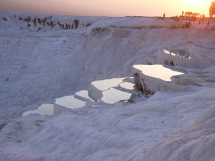 こちらの石灰棚まで来る観光客もまばらで先客は1名。あとからも2人しか来なくて、ゆっくりと石灰棚と夕焼けの雄大な景色を堪能できた。ああ、パムッカレに来たのだなぁ。綿の城を目の前にしているのだ。ここにきてようやく、心静かに石灰棚の風景を目に焼き付けることができた。