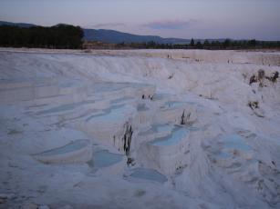 どよめきで目覚めたら、パムッカレの石灰棚がバスの中から見えていた。18時30分。ついに今ツアー個人的な2番目のハイライトのパムッカレが見えるところに来たのだ!早く石灰棚を歩きたい!