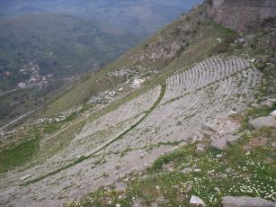 このアーチから外に出ると、↓の世界一の急斜面にある劇場。ニハットさんが最上段から5、6段降りて、私たちは最上段かその1つ下に降りて座って音響効果の確認をしながら、遺跡の説明を聞く。下から吹き上げてくる風でニハットさんの声はバッチリ聞こえる。