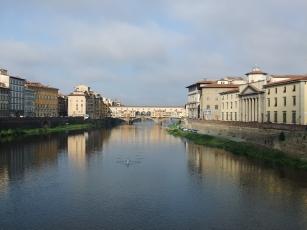 フィレンツェ旧市街まで大型観光バスは入れないため、アルノ川河畔のグラツィエ橋近辺で下車。グラツィエ橋からヴェッキオ橋を眺めました。