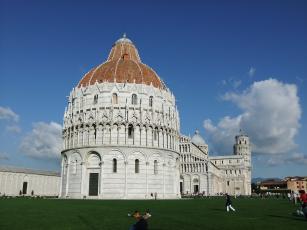 洗礼堂、ドゥオーモ、ピサの斜塔の3点セットが見られる広場は観光客で大賑わい。