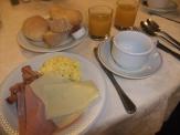 このホテルも朝食にヨーグルトとフルーツポンチがありません。(涙) パンとベーコン、ハム、チーズとジュース、コーヒーの朝食。