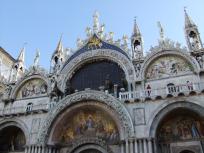 サンマルコ寺院の正面上部にあるのはヴェネツィアの守護聖人聖マルコの像。その下には黄金の有翼の獅子像が、さらにその下には4頭のブロンズ製の馬像があります。