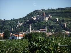 11時50分、ヴェローナでも、バスが最初に寄るところは観光税を支払うオフィス。オフィスの近くに、→のようにブドウ畑の向こうの丘の上に城塞と城塞に続く城壁が見えました。ロマンチック♪