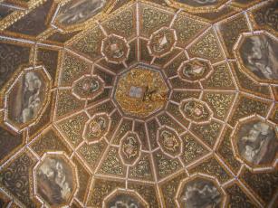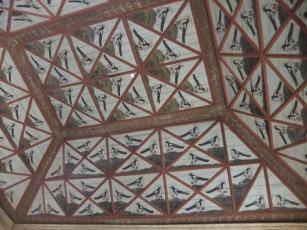 カササギの間は、とある王さまが侍女にキスしたところを王妃さまに目撃され、「善意でした」と釈明したのが、あっと言う間にウワサになって広まってしまったので、侍女をおしゃべりな鳥と言われるカササギに例え、「善意で」と書かれた布を嘴に挟んみ、王妃さまの出身国を表す薔薇を持ったカササギを侍女の数だけ天井に画いて、噂話を諌めたのだとか。でも、噂話云々以前に、侍女にキスをする王さまがどうかなぁ。