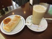チーズを使った丸いお菓子のケイジャータ0.9EUR(約108円)とアーモンド入り卵クリームがパイ生地に挟まれてグラニュー糖がまぶしてあるトラベッセーロ1.3EUR(約156円)、各1つずつと、ガラオンはグラス容器に入ったミルクコーヒー1.8EUR(約216円)×2つで合計5.8EUR(約696円)。ケイジャータとトラベッセーロは2人でシェアしました。どちらも甘いけど、トラベッセーロのほうがより甘かったかな。