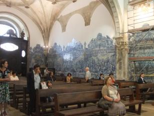 主祭壇近くから修道院内部を観ながら、じょじょに入口方向へ移動。修道院内部は美しいアズレージョで飾られています。
