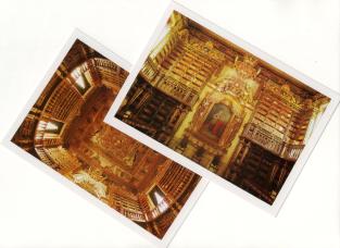 図書館なのに、柱は装飾着きのネジリン棒。しかも金箔ピカピカ。2階バルコニーの手摺りにも装飾。内部の装飾と天井画が素晴らしい!