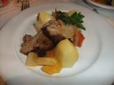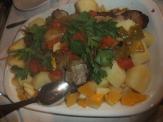 豚肉と野菜の煮込みは、煮込みというより豚肉の温野菜と果物添えな感じ。トマトがスパイシーで、パイナップルやりんごも温かくなっていました。