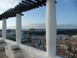 鳩さんが特等席から青い海とナザレの街を見下ろしていました。(爆)