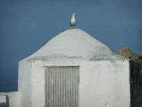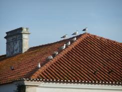 ふと、ナザレの聖母広場を取り囲む家の屋根に目をやると、↓そこには同じ方向を向いて、すっくと立つかもめさんたちがいました。