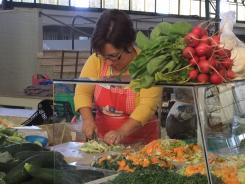 →は生野菜サラダ屋さんです。その場で野菜をざっくざっく切って、少なくなっているお皿にザザッと補充していました。切りたて新鮮!こういうサラダ屋さんだったら買ってみたいな〜。