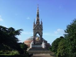 この像の正面にあるエンジ色の建物はロイヤル・アルバート・ホール。1870年に建てられたイギリスでも有名なコンサートホールだそうです。
