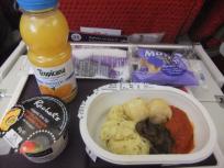 メニューは洋風朝食かベジタリアン英国式朝食からの選択で、ベジタリアンをチョイスしてみました。で、見事にポテトを一口しか食べられず、マフィンとヨーグルトを美味しくいただきました。温かいお飲み物の写真がないのですが、機内食で温かいお飲み物のサービスがなかったとは考えられないので、おそらく写真を撮り忘れたのではないかと思われます。もう、それすら覚えていません(汗)。