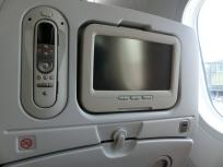 席に着いてみると、足元がこれまでの日本発着の航空機のものよりも広くて、変な出っ張りもなくて足が伸ばし易い構造でした。パーソナルディスプレイもこれまで見たものよりも大きくて解像度が良くて映画が鮮明に見えましたし、隣りの席の人が何を見ているのか見えない(見え難い)画面になっていました。