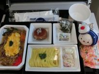 和食は牛丼で洋食は白身魚。えむちゃんも私も牛丼をチョイスしたらCAさん(ドリンクサービスのCAさんとは別の方)に「和食と洋食を1つずつ取ってシェアしたら」と勧められてしまいました。でも、航空会社のHPで機内食をチェックしたときから和食と決めていたので、断固、和食!