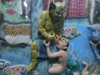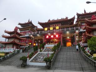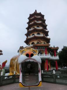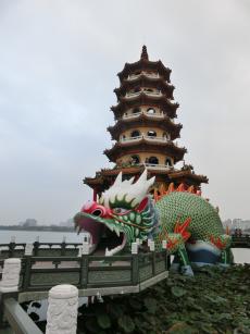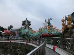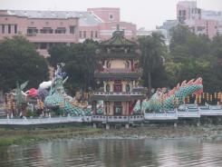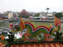 龍の塔の階段を登り上に出たら、可愛い龍さんの像があったので、池と慈済宮をバックに記念撮影。こうして見ると、日本とは随分色彩感覚が異なって、色鮮やかに多くの色が隙間無く塗られています。もの凄~く原色がたくさんで目にちかちか。