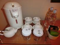 部屋の←のソファに座って、ホテルに備付けの湯沸しポット→を使ってお湯を沸かして、ウーロン茶と緑茶をありがたくいただいて、お水はお持ち帰りさせていただきました。