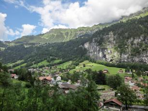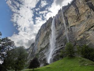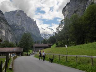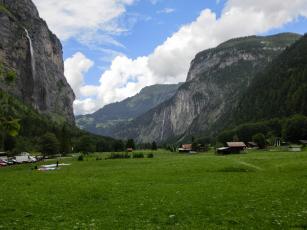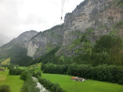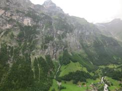 そうこうしているうちに、15時18分、シュタウフバッハの滝に到着。滝壺近くまで行き、フリータイム。ちょっと小高い場所にある観瀑所?まで、ツアーメンバーのお一方とがんばって登りました。そこで目にしたのが右下の“いかにもスイス”な風景。