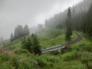 10時10分、グリュッチュアルプ発。霧でロープウェイからの視界はほとんどなし。