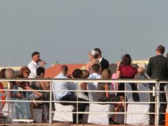 →なんと、そこでは船上結婚式の真っ最中。晴天の下の船上結婚式。気持ちがいいでしょうね。新郎&新婦さん、お幸せに♪
