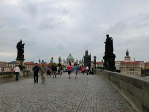 ヴルタヴァ川にかかるプラハ最古の石橋のカレル橋。両側の欄干には聖人の彫像が並んでいます。