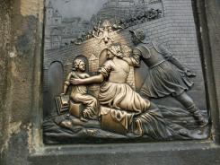 この聖ヤン・ネポムツキー像の台座に刻まれた聖ヤン・ネポムツキーの殉教のレリーフに触れると幸運が訪れるそうで、→のとおり、皆が触ってピカピカです(笑)。