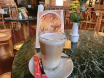 こちらのカフェでは、メニューがミュシャしています。それがこのカフェでお茶することにした理由でもあります。 えむちゃん熱望の冷たいお飲物がありましたので、その中から嬉々としてアイス・ラテ・マキアートを注文2.9EUR(会計時に2人分で6EUR(約780円)支払)。