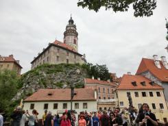 ガイドさんに案内されて、駐車場から高台にあるチェスキー・クルムロフ城まで、ゆっくりゆっくり上ります。ゆっくりだけど、ツアーメンバーさんが縦に長〜く離れてしまったのは、上り坂のせい?