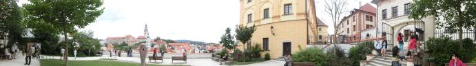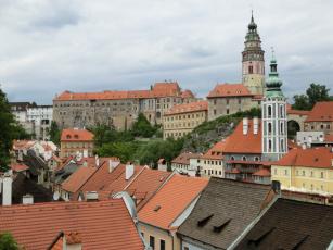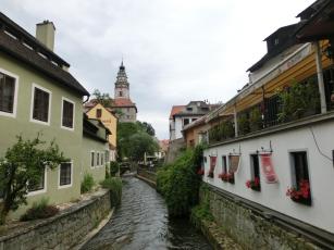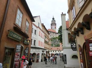 旧市街に入って少し進み、振り返ると高台にチェスキー・クルムロフ城の塔がそびえ立っているのが見えます。