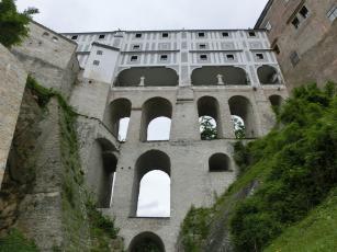 このチェスキー・クルムロフ城では、建物にだまし絵の手法が用いられています。建物の壁は石ではなく、絵で描かれたものです。