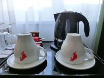 部屋に湯沸しがあります。コーヒーカップとソーサーは今回の中欧旅行のホテルの中で1番オシャレかな。