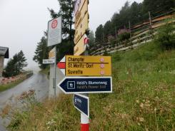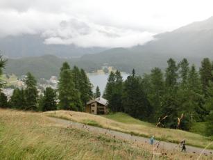 小雨がパラつく生憎の天気の中でも、いざ散策するとスイスをハイキングしている気分になるのか、誰言うとでもなく駅に戻らずにサン・モリッツまでハイキング・コースを歩いて行くことになりました。私は、このハイキングコースを歩く気満々で計画していたのでラッキー♪