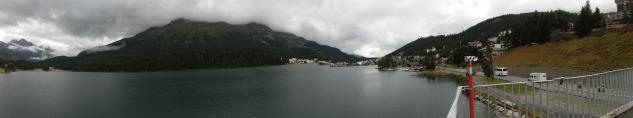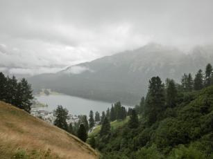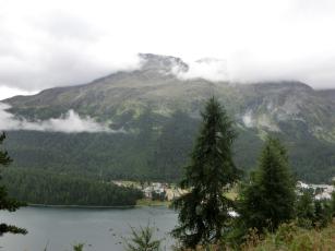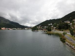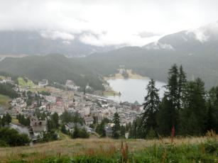 ときどき木が途切れ、見晴のよい場所に出るとサン・モリッツ湖とサン・モリッツの街が望めました↑→。