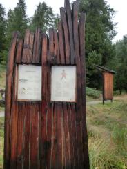 ウルスリのすずの道に入り、説明板を見たり、木製のオブジェと記念写真を撮ったり、サン・モリッツ湖の眺めを見たりしながら、下っていきます。
