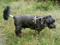 お散歩中の犬お散歩中のトイプードルに出会いました。スイスの山では珍しい小型犬との出会い。茶筅髷(ちゃせんまげ)のような尾のカットがプリティで、飼い主さんの了承をいただいて写真を撮りました。