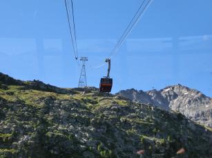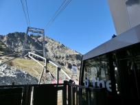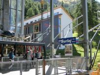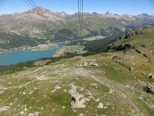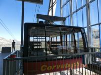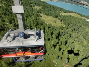 何と!MurtelからSurlejへ下るときにすれ違った上りのロープウェイには、ロープウェイの人が乗車する部分の下の荷台に、作業用車両が乗っていました←!ロープウェイは観光客だけではなく、山腹・山頂へ物資の輸送もしているのですね。