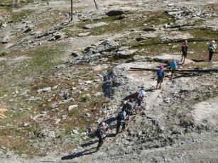 足元に目をやると、トレッキングコースを登ってくるグループの姿が見えました。ロープウェイだと簡単・楽ちん・短時間で登れるところをベルニナ・アルプスで登山する方々。天気がいいので、この日のトレッキングは気持ちよかったことでしょう。