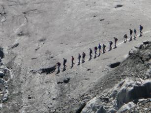 氷河をよ〜く見ていたら、氷河トレッキングをしているグループが1列になって歩いていました。さすが!スイスの夏山!!