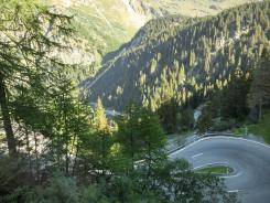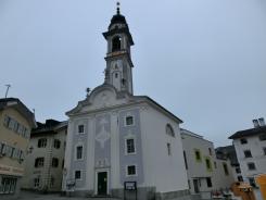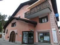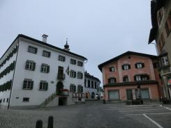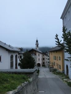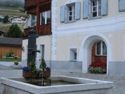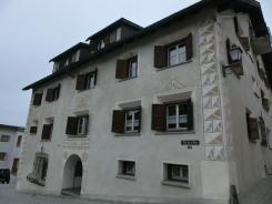 ←スグラフィット技法で飾られた家。エンガディン地方の多くの建物の壁に施されているスグラフィット技法とは、2層の色の違う漆喰の表面を掻き落として線画を描く技法のことだそうです。