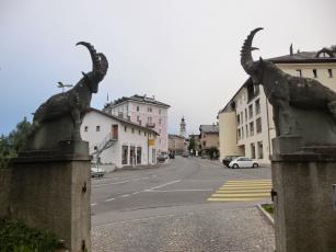 ホテルへの道をぶらぶら歩いていたら、シュタインボック(大きなツノのヤギ)の彫刻を乗せた立派な門扉があったので、そこから旧市街方向を1枚→。写真中央やや左のピンクの壁の建物が宿泊していたホテルです。