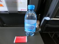 機内サービスは、搭乗した航空機会社のロゴ入りのチョコ1枚とお水1本。飛んでいる時間は1時間ないので、十分。