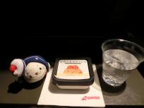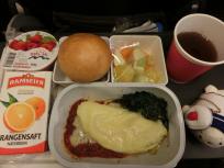 5時45分(日本時間、以下同じ)、2回目の機内食はオムレツ。オムレツには手をつけず、ジュース、フルーツ、ヨーグルトのみ食べました。お飲物は、温かいお飲物で紅茶と緑茶を1杯づついただきました。