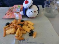 温かいお飲物に野菜スープ(玉ねぎ風味)と紅茶をいただきました。和食の機内食は普通においしくて完食。