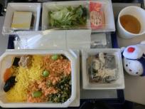 10時30分、機内食は紅鮭の彩りご飯とタンドリーチキンの2択で、紅鮭の彩りご飯をチョイス。
