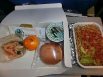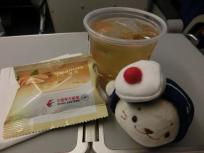 パンと前菜ザーサイ(チキン、キュウリ、ニンジン入り)を少々食べ、デザートのみかんを食べました。機内食のパックに入っていたドリンクはプラムジュースかな?温かい飲み物はコーヒー。