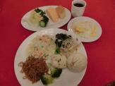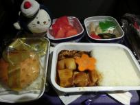 搭乗してから1時間25分後の18時20分、機内食。ポークorフィッシュでポークをチョイス。温かい飲み物は中国茶。