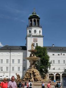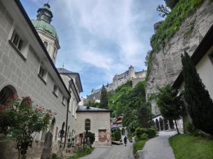 フリータイム後、再集合して現地ガイドさんに率いられてミラベル宮殿から徒歩で旧市街へ向かいます。途中、三位一体教会やモーツァルトの住居(右の写真の向かって右端の建物)の近くを通ります。