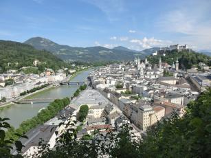 ヘッドヴェア・バスタイからは、先ほど訪れたメンヒスベルクの丘が見えます←。中世の堡塁跡にあるヘッドヴェア・バスタイは、旧市街とは川を隔てているので、メンヒスベルクの丘からの眺望とはまた一味ちがったホーエンザルツブルク城と旧市街が眺められました。