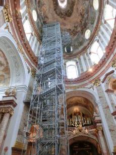 カールス教会では、2018年5月時点で天井画の修復工事中で、その修復工事用の仮設エレベータを一般見学者に解放していました。教会の入場料に仮設エレベータ代が含まれているのです。太っ腹。